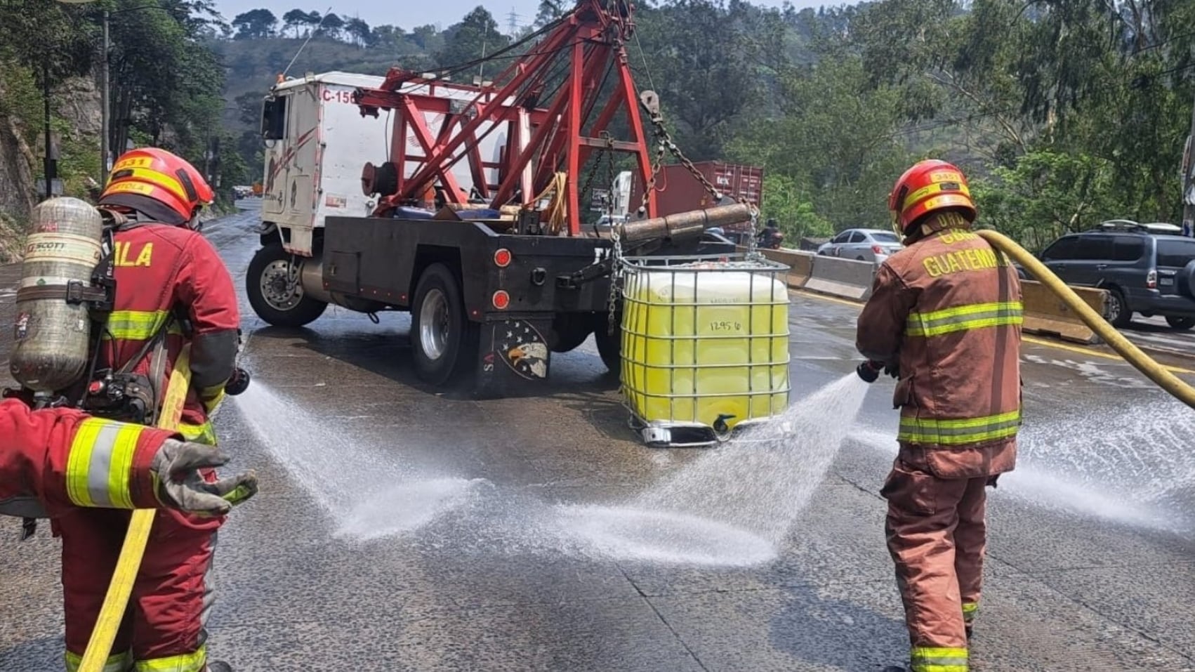 Henry Quevedo, vocero de la PMT de Villa Nueva, informó que un camión que trasladaba recipientes con cloro dejó botados tres recipientes sobre la cinta asfáltica.