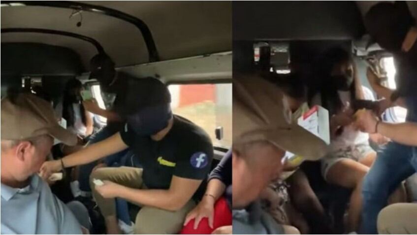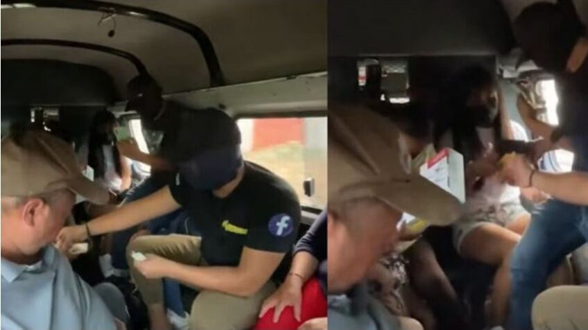 Mientras el conductor continuaba su marcha, los hombres continuaron pidiendo a los demás pasajeros que les mostraran sus cosas y que bajaran la cabeza, gritando que los presuntos agresores seguían regalando cosas.