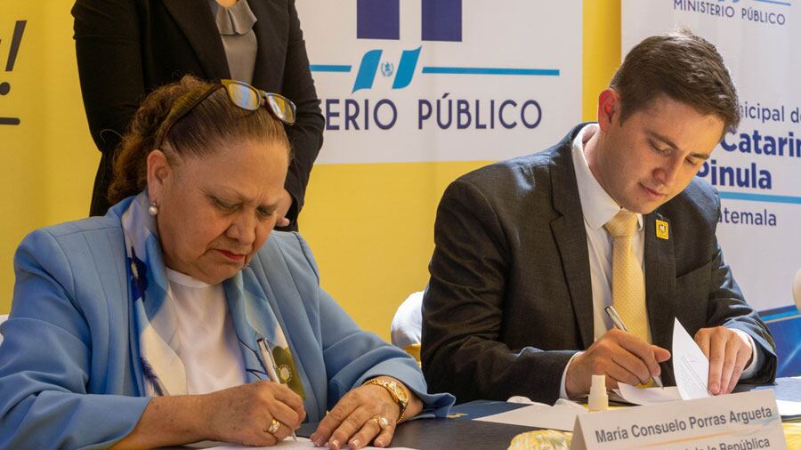 El alcalde de la Municipalidad de Santa Catarina Pinula la fiscal general y jefa del Ministerio Público (MP), María Consuelo Porras Argueta, firmaron un convenio para la creación de una nueva Fiscalía contra las Extorsiones.