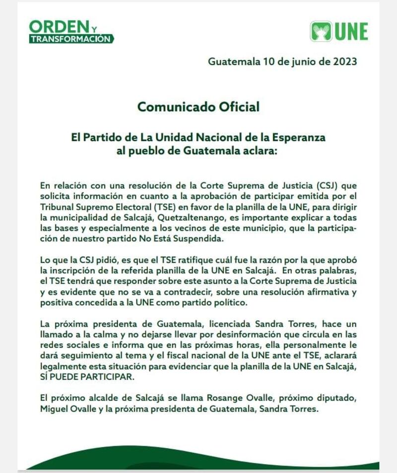 “Lo que la CSJ pidió es que el TSE ratifique las razones por las que aprobó la inscripción de la planilla de la UNE en Salcajá. En otras palabras, el TSE tendrá que responder sobre este asunto a la CSJ, y es evidente que no se va a contradecir sobre una resolución afirmativa y positiva concedida a la UNE como partido político”, indica el comunicado.