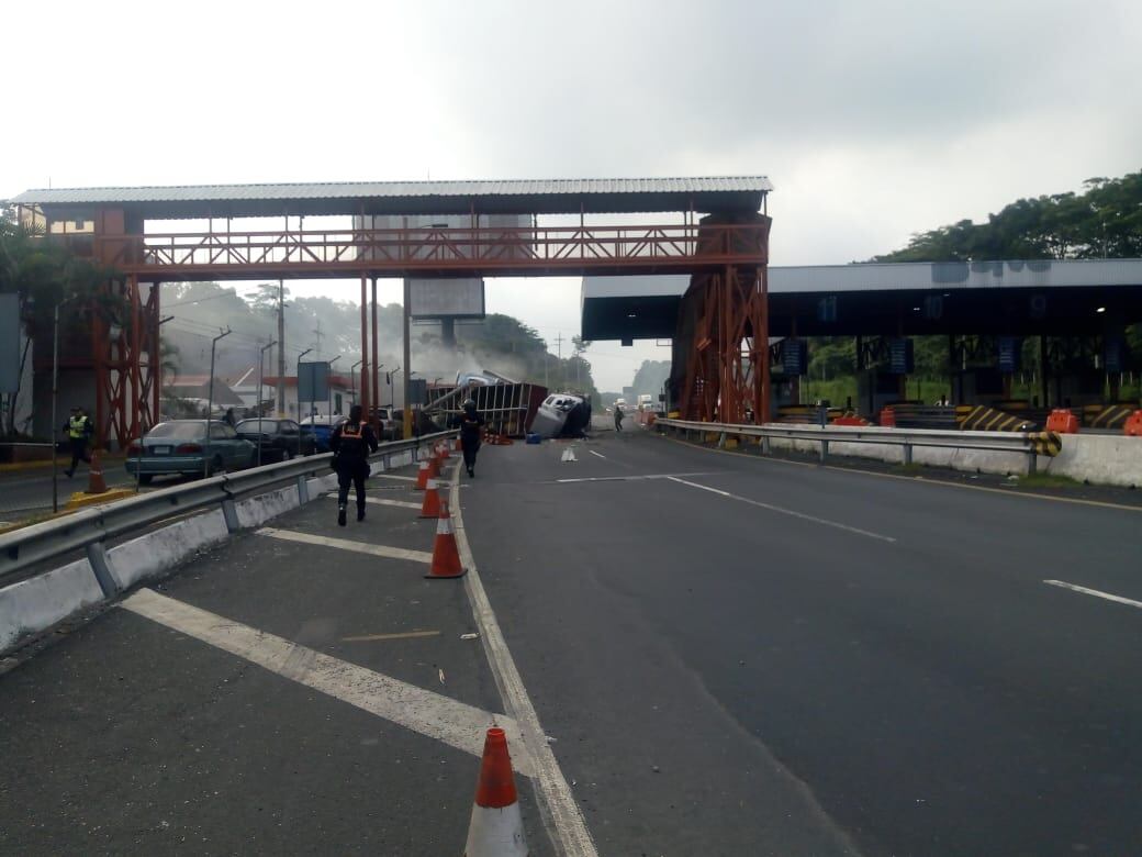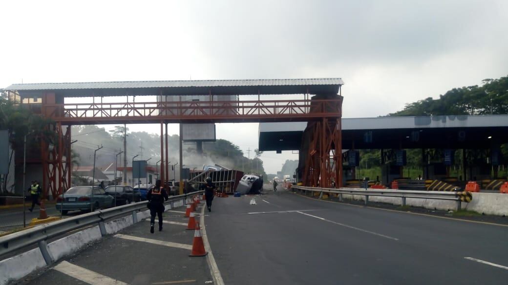 Uno de los dos vehículos, un camión de carga, que transportaba ganado, quedó volcado a un costado de la garita de peaje.