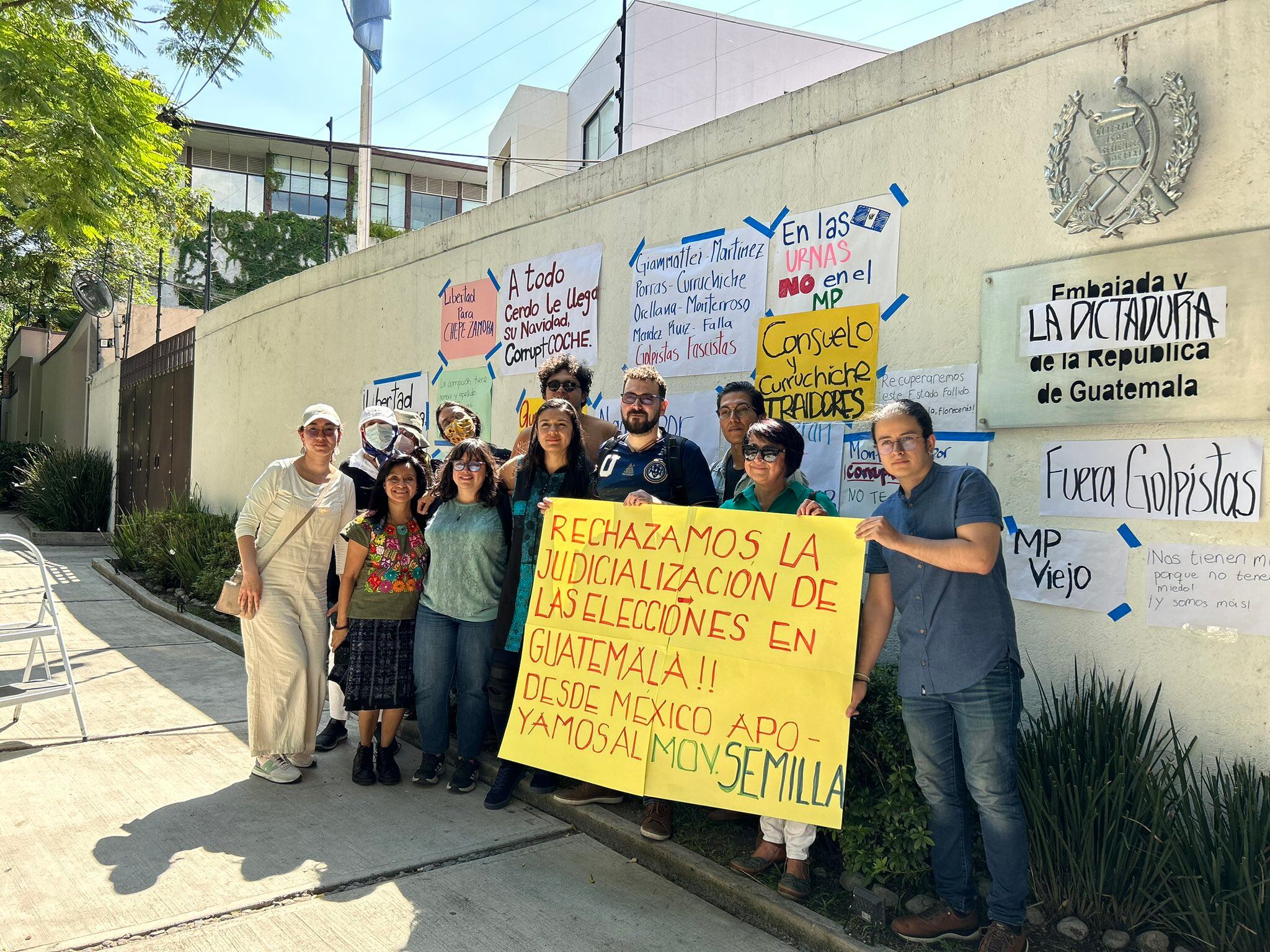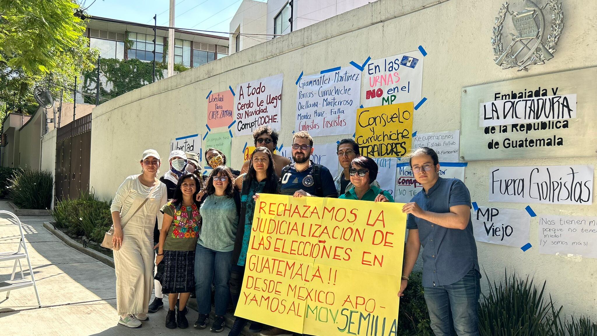 Frente a la Embajada de Guatemala en Ciudad de México, un grupo de ciudadanos colocó carteles en defensa de la voluntad popular. Asimismo, exigió la renuncia de la fiscal general del Ministerio Público (MP), María Consuelo Porras, y del fiscal anticorrupción Rafael Curruchiche.