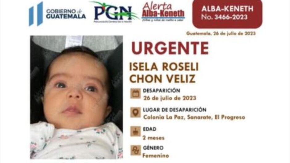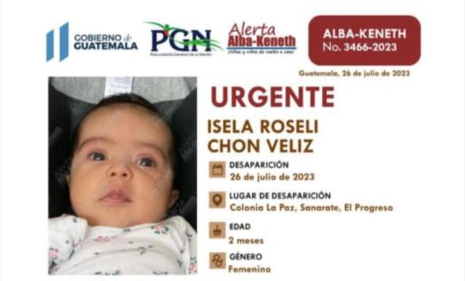 El pasado miércoles, 26 de julio, se activó una alerta Alba-Keneth porque una menor de tres meses de nacida se encuentra desaparecida y cuyo progenitor es el principal sospechoso de habérsela llevado. Se trata de Isela Roseli Chon Veliz, quien desapareció en la colonia La Paz, Sanarate, El Progreso.