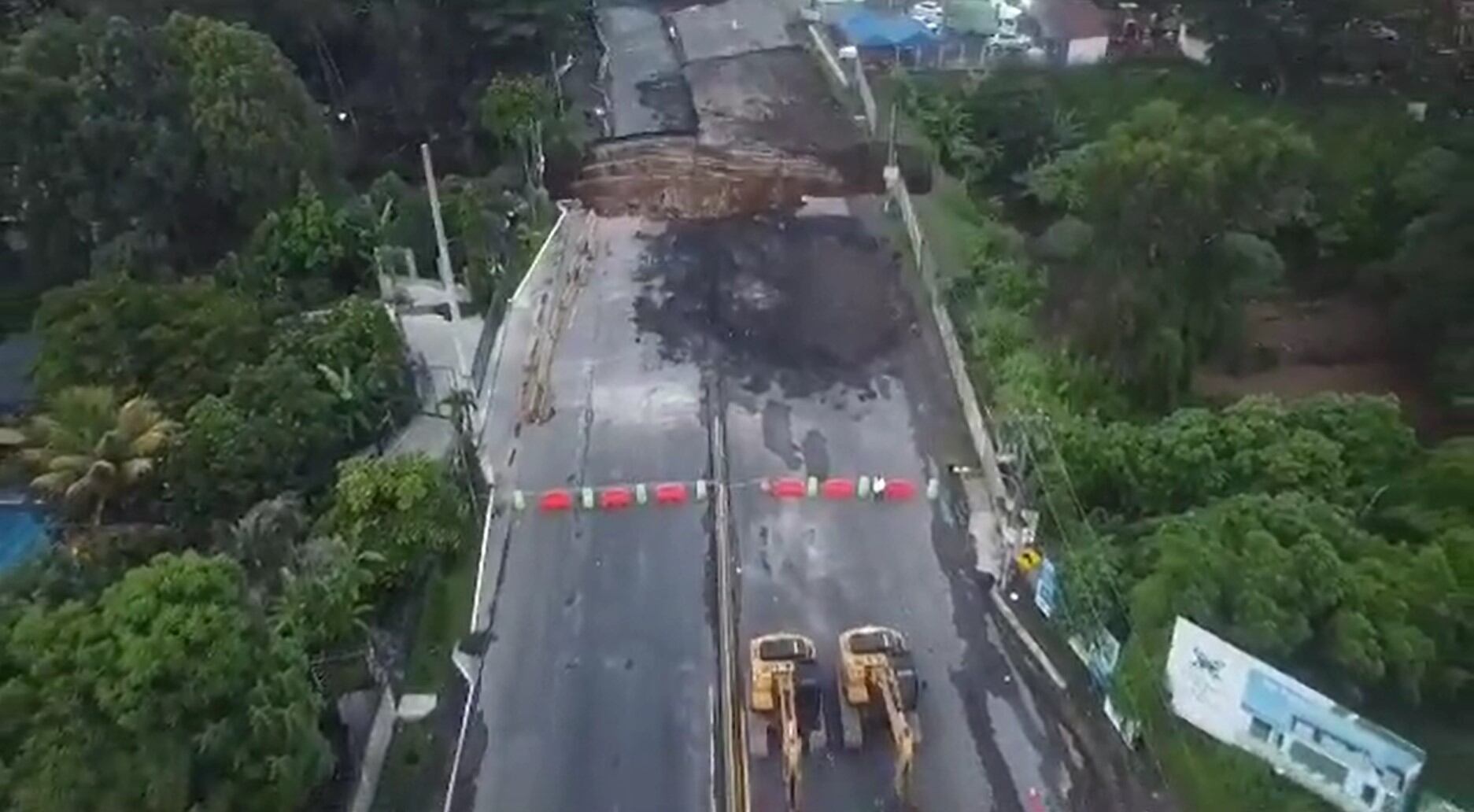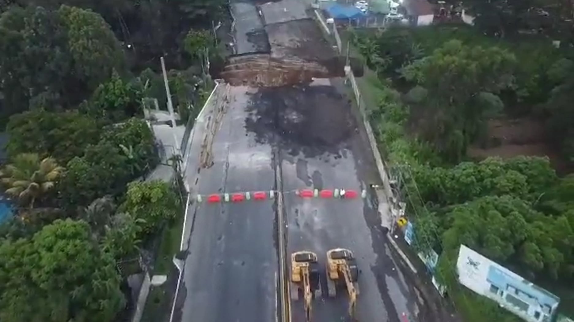Con el apoyo de un drone, las autoridades evidenciaron la destrucción de los cinco carriles en el kilómetro 17.5 y en las mismas se puede observar el paso del río Platanitos, esto luego del colapso de los colectores.