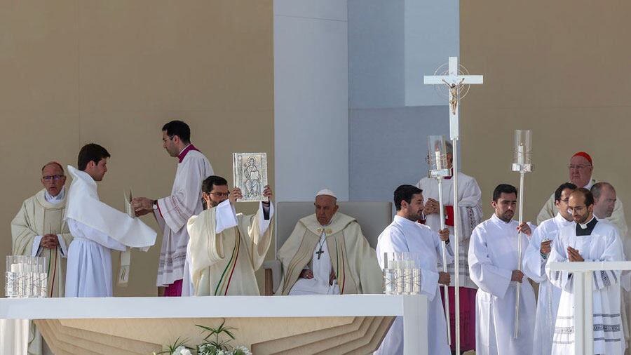 Después de un extenso recorrido en “papamóvil”, Francisco presidió la misa desde el colosal altar que dominaba el recinto a las puertas de Lisboa, repleto hoy de fieles agitando sus banderas, además de 10.000 sacerdotes, 700 obispos y 30 cardenales.