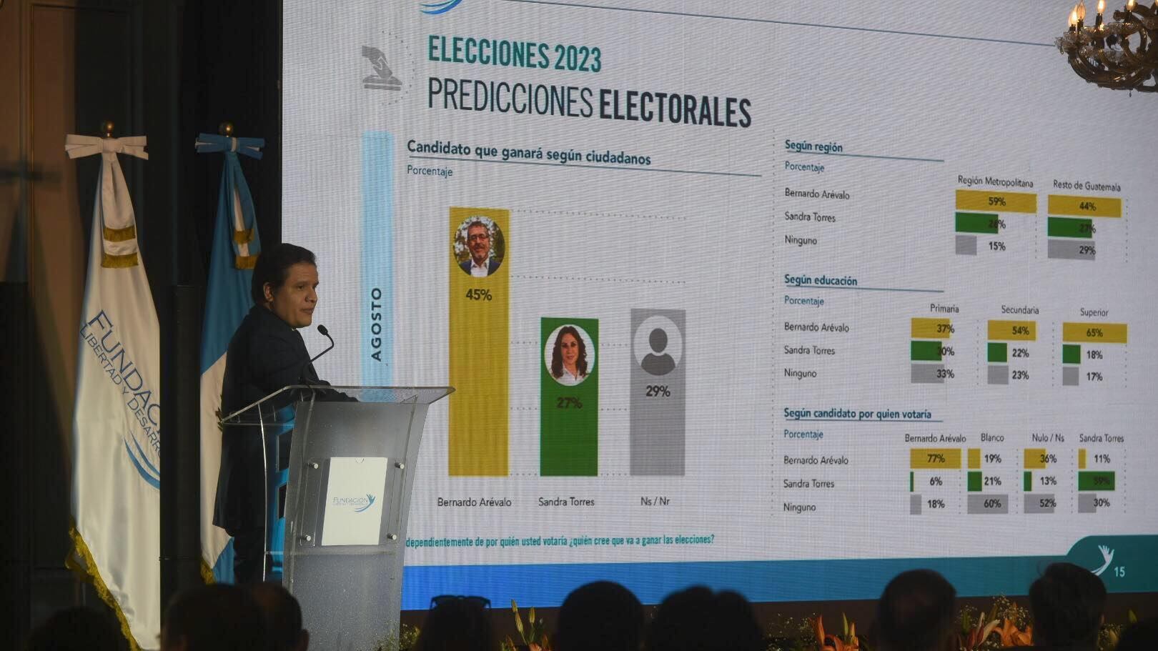 La medición destaca que Bernardo Arévalo cuenta con una intención de voto del 64 por ciento, mientras que Sandra Torres, tendría una intención de voto del 36 por ciento de los sufragios válidos de guatemaltecos que respondieron que muy probablemente asistir a votar este domingo 20 de agosto, detalló Paul Boteo, Director Ejecutivo de Fundación Libertad y Desarrollo.