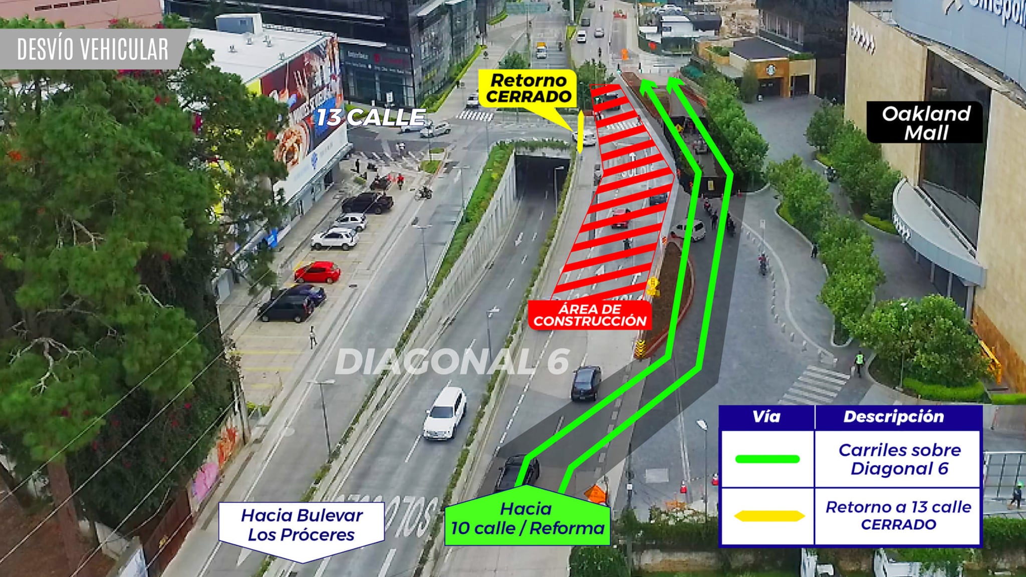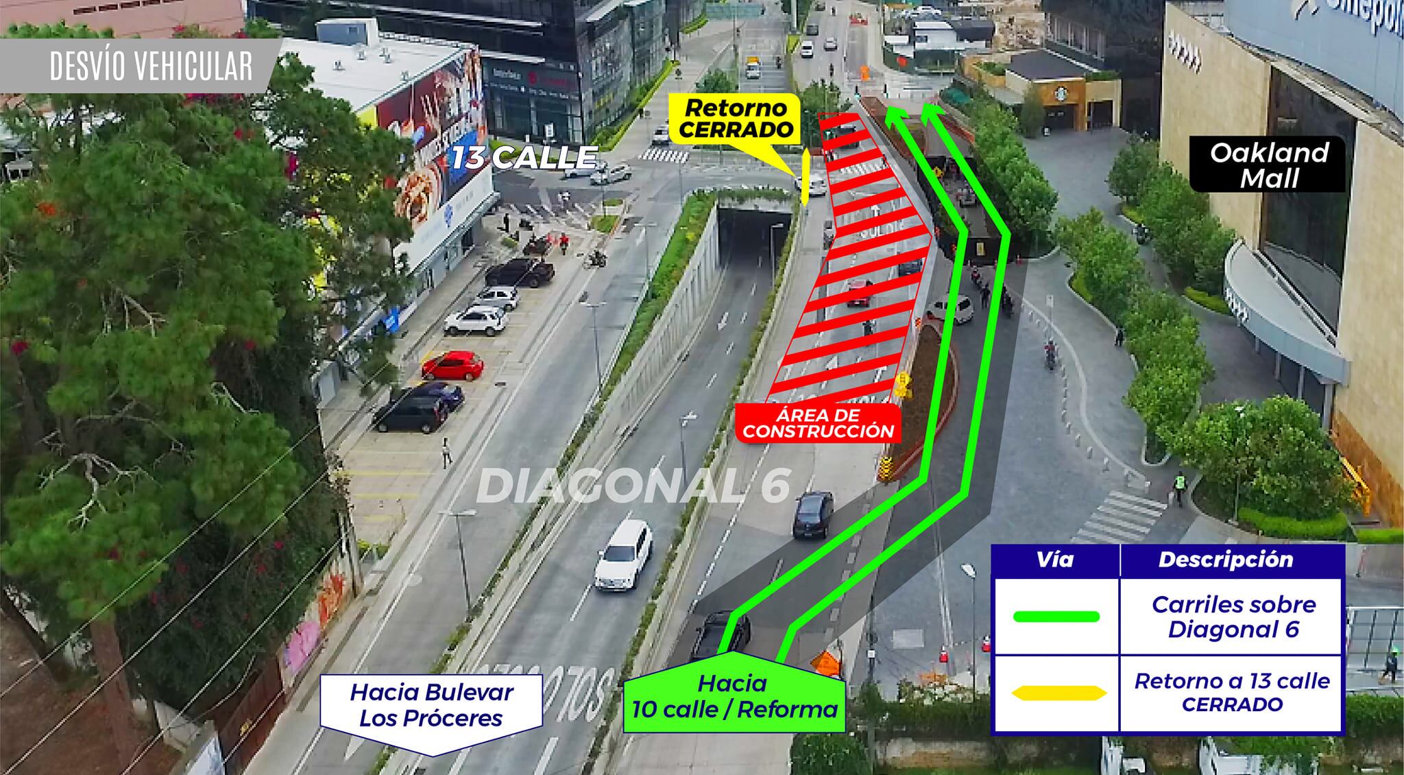 El funcionario explicó que a partir del 23 de agosto, durante tres meses, se realizará una intervención de la vía pública, por lo que los automovilistas que se desplazan de bulevar Los Próceres sobre la Diagonal 6, no podrán virar a la izquierda sobre 13 calle y deberán hacerlo en el paso a desnivel Bedoya de Molina en la Diagonal 6 y 10ma. calle de la zona 10.