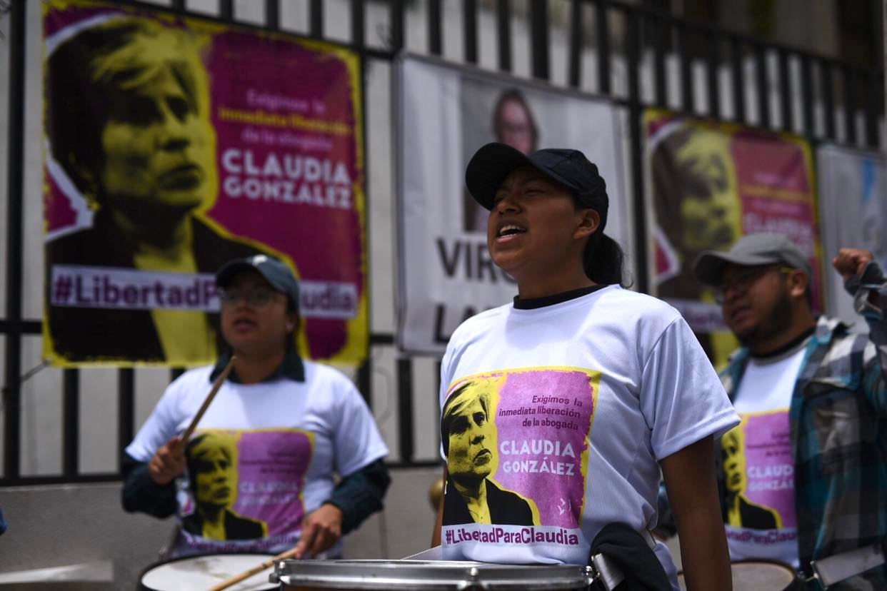 Un grupo de personas realiza un plantón frente a la Torre de Tribunales en apoyo y solidaridad a la abogada Claudia González, ex mandataria de la Comisión Internacional Contra la Impunidad en Guatemala (CICIG) quien acudió este miércoles 6 de septiembre a la audiencia de primera declaración la cual fue declarada bajo reserva y lleva una hora de retraso.