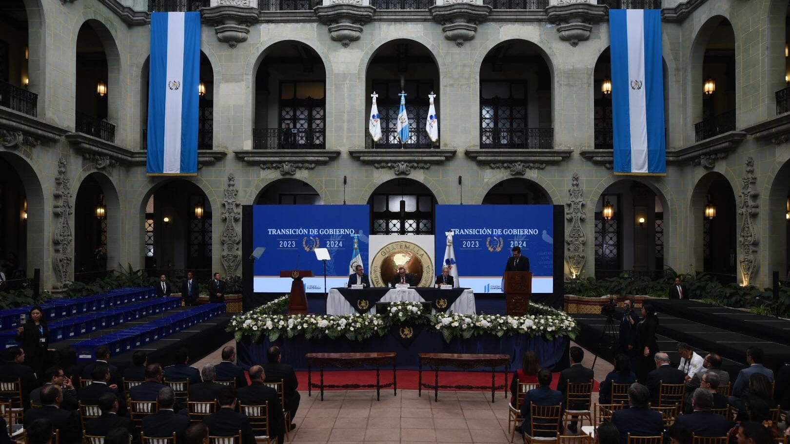 El Presidente Alejandro Giammattei realiza la entrega oficial de las carpetas institucionales y la plataforma de Transición, la tarde de este lunes 11 de septiembre al presidente electo Bernardo Arévalo, a la vicepresidenta electa, Karin Herrera y a su equipo de transición.