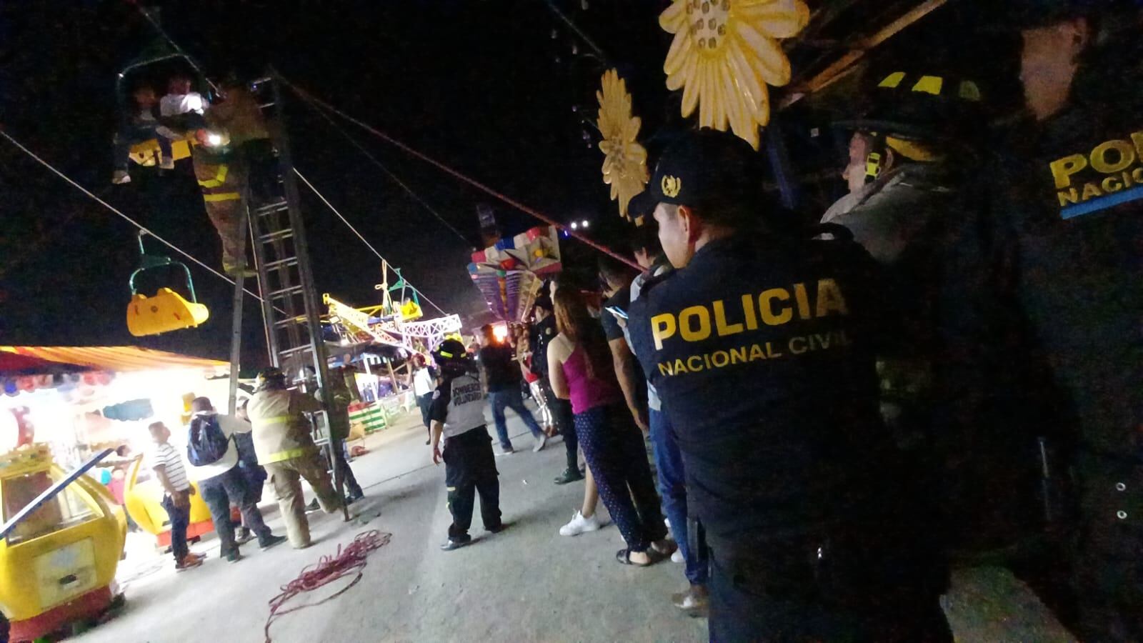 Con el apoyo de la PNC, los socorristas lograron rescatar a las cuatro personas que estaban suspendidas en los asientos del juego mecánico.