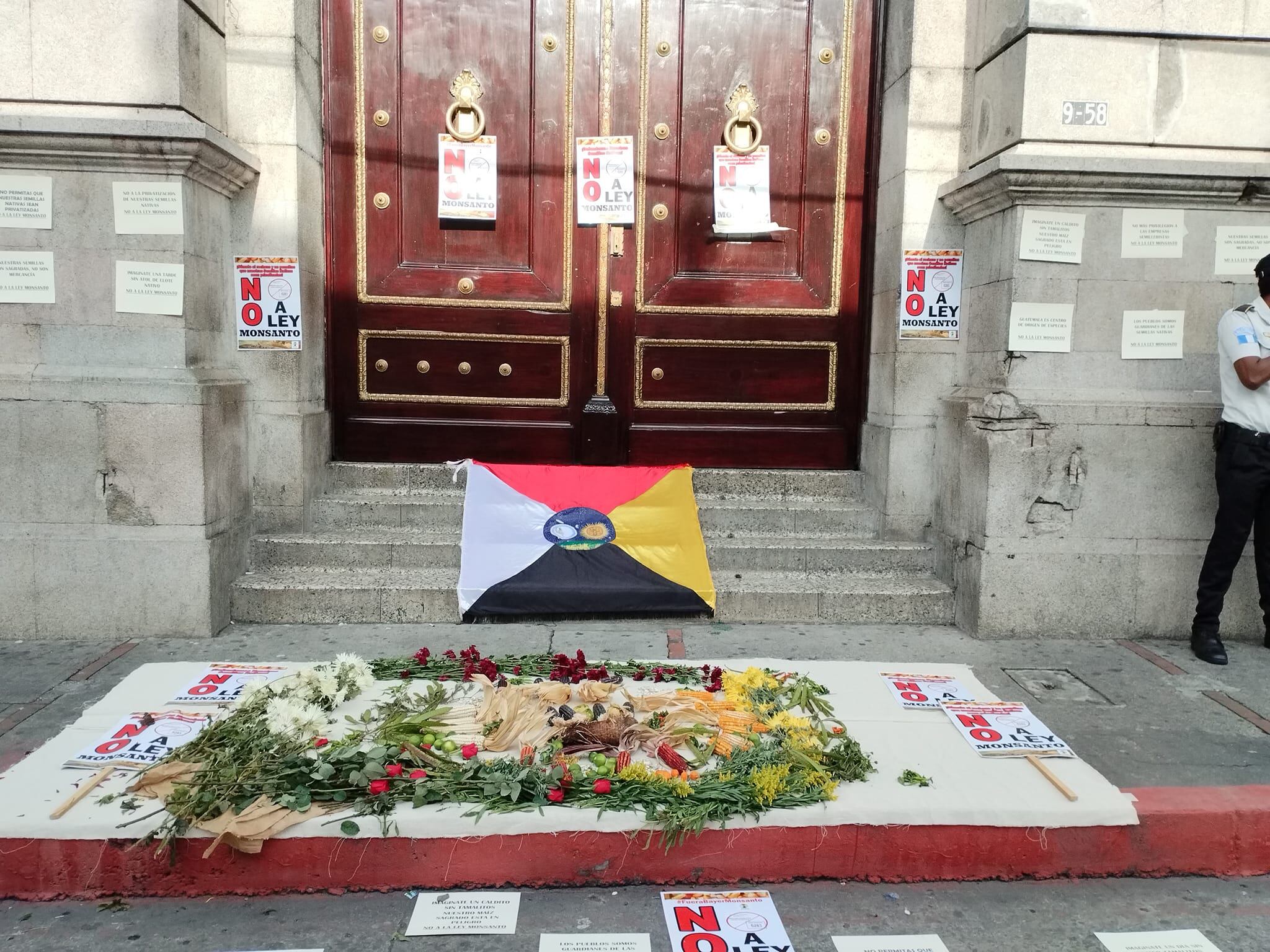 Miembros de la Red Nacional por la Defensa de la Soberanía Alimentaria en Guatemala (Redsag) bloquean el paso frente al Congreso de la República en la zona 1 de la capital, la mañana de este miércoles, 13 de septiembre, en rechazo a la iniciativa de Ley de Protección de Obtenciones Vegetales 6283, Ley Monsanto.
