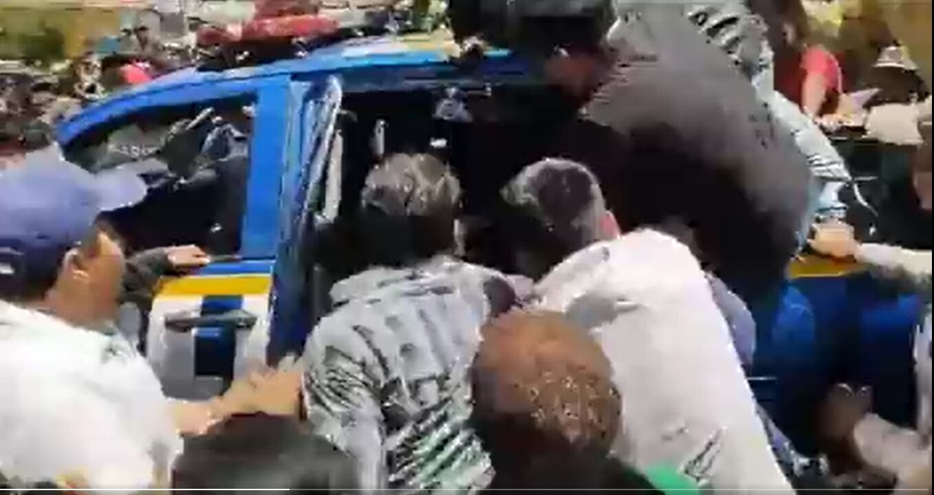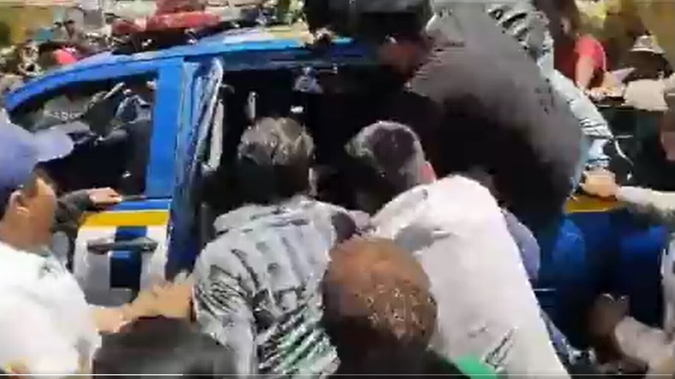 En redes sociales circulan videos de los hechos ocurridos en Sacapulas, en uno de ellos se puede observar cómo los dos supuestos atacantes son extraídos de una patrulla de la Policía Nacional Civil (PNC), luego una turba los golpea.