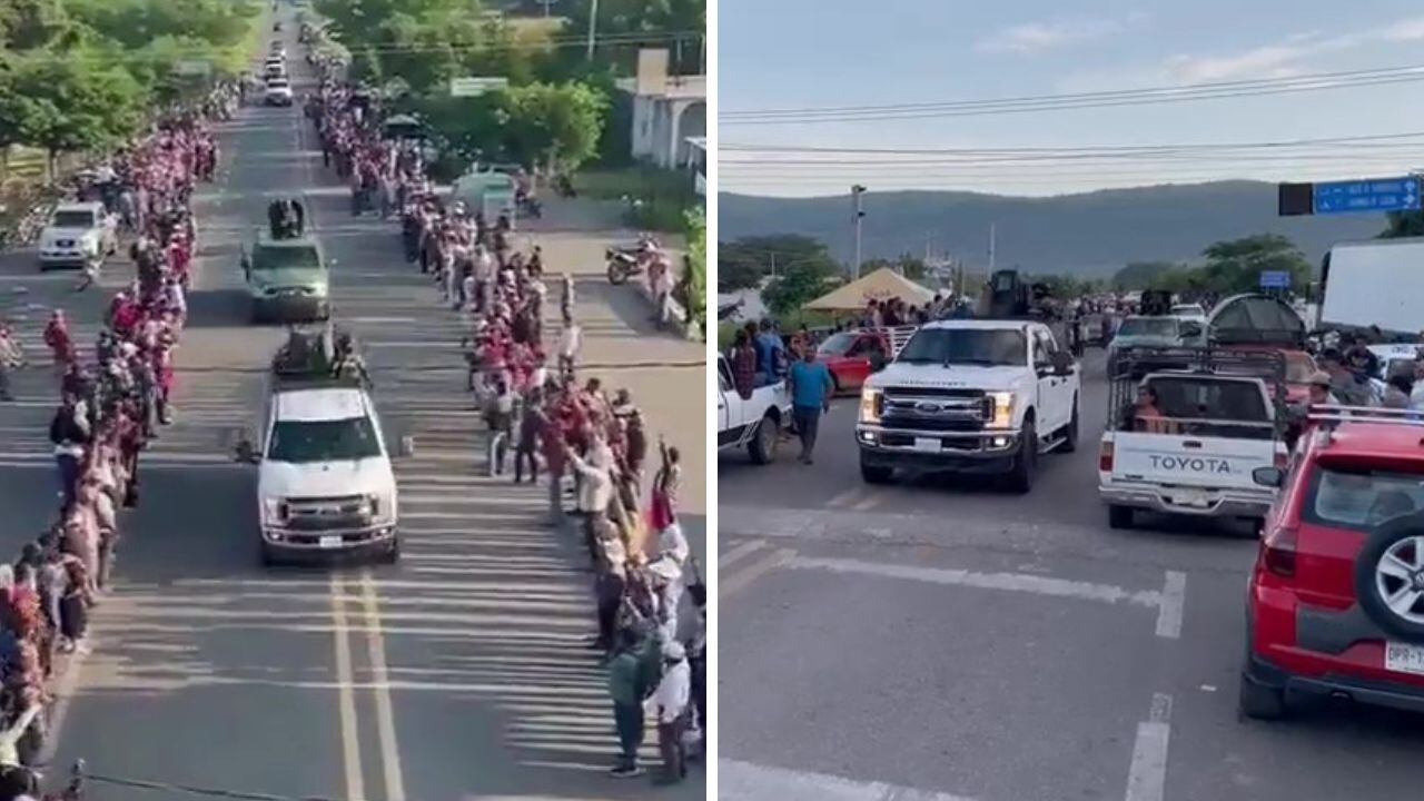 Videos compartidos en redes sociales muestran el momento en que un grupo de decenas de personas aplauden y gritan: “vamos con todo” a los sicarios que pasan en sus camionetas con equipo bélico y sonando las bocinas.
