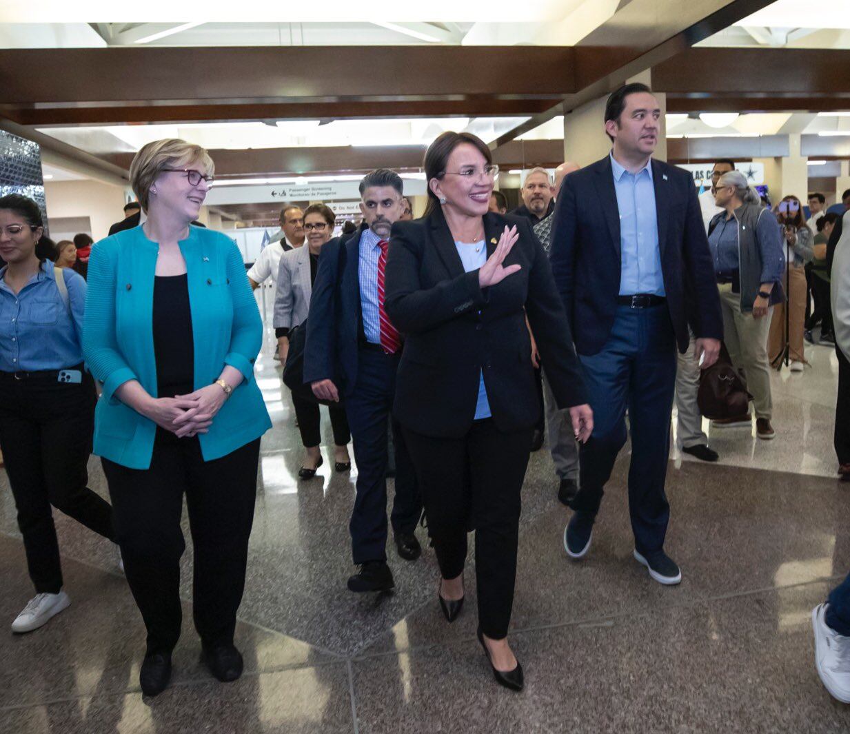 La gobernante llegó a la ciudad de MacAllen, Texas, en compañía del secretario de Seguridad Interior de Estados Unidos, Alejandro Mayorkas, con quien abordó en una reunión la problemática migratoria y sus posibles soluciones.