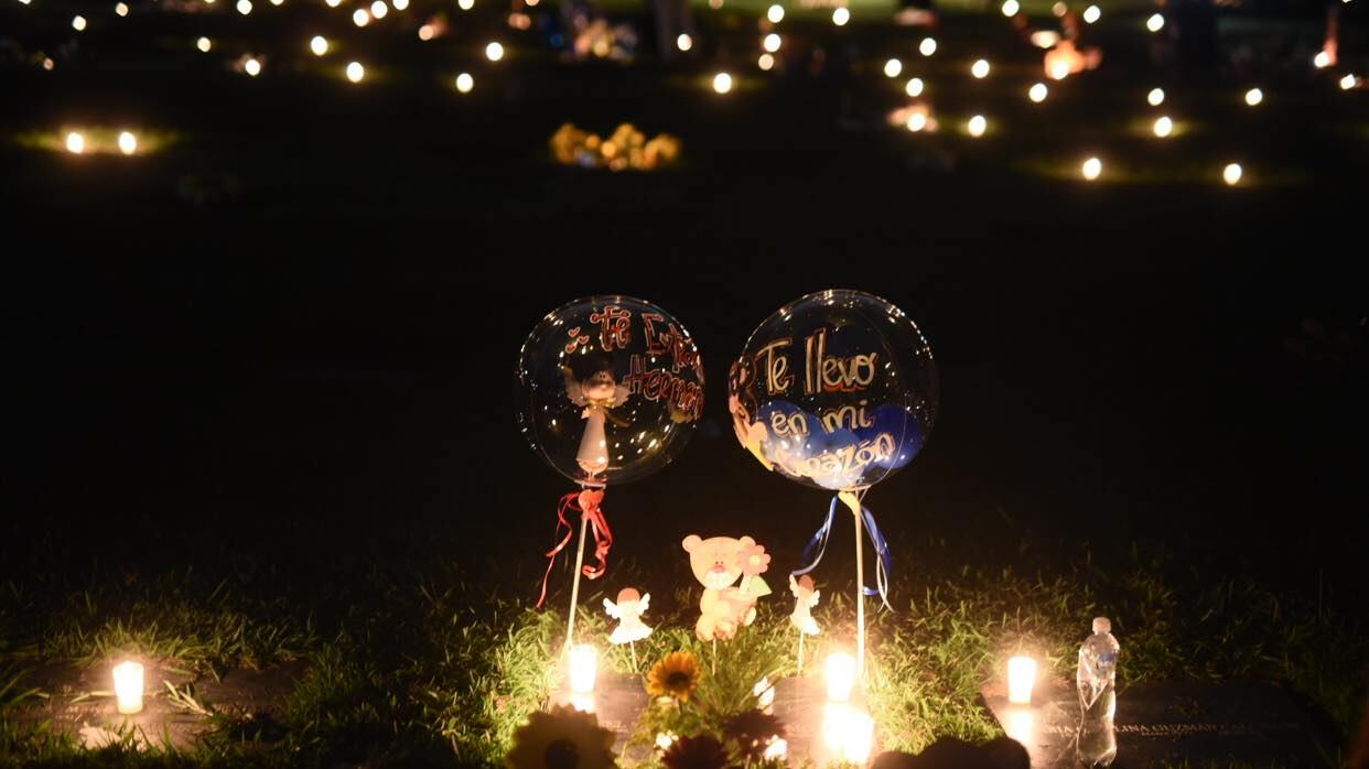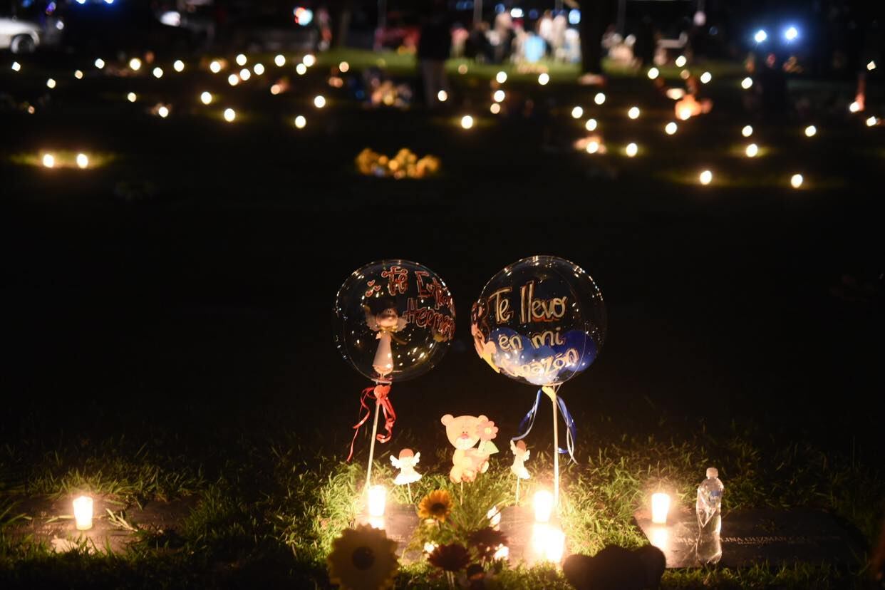 Las lápidas del camposanto fueron iluminadas con velas y adornadas con globos, carteles, flores y otros objetos que resaltaron rápidamente a la vista.