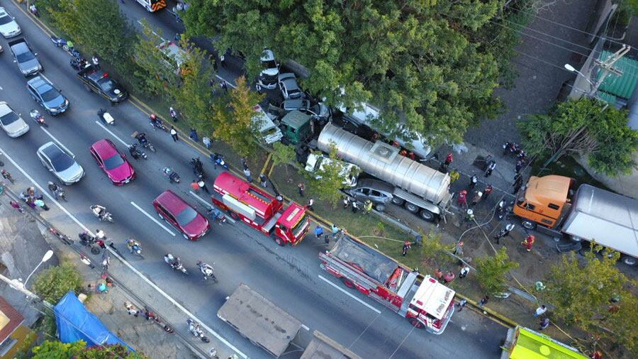 De acuerdo con los reportes preliminares, el conductor de un camión cisterna perdió el control por lo que chocó en contra de varios vehículos livianos.