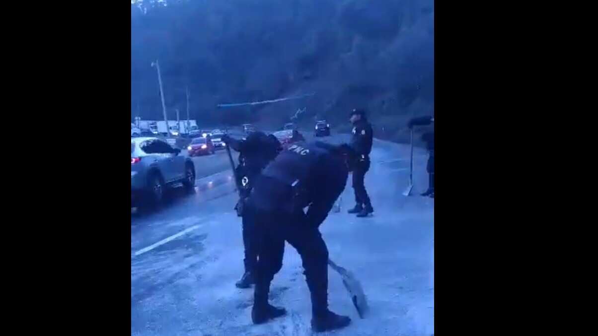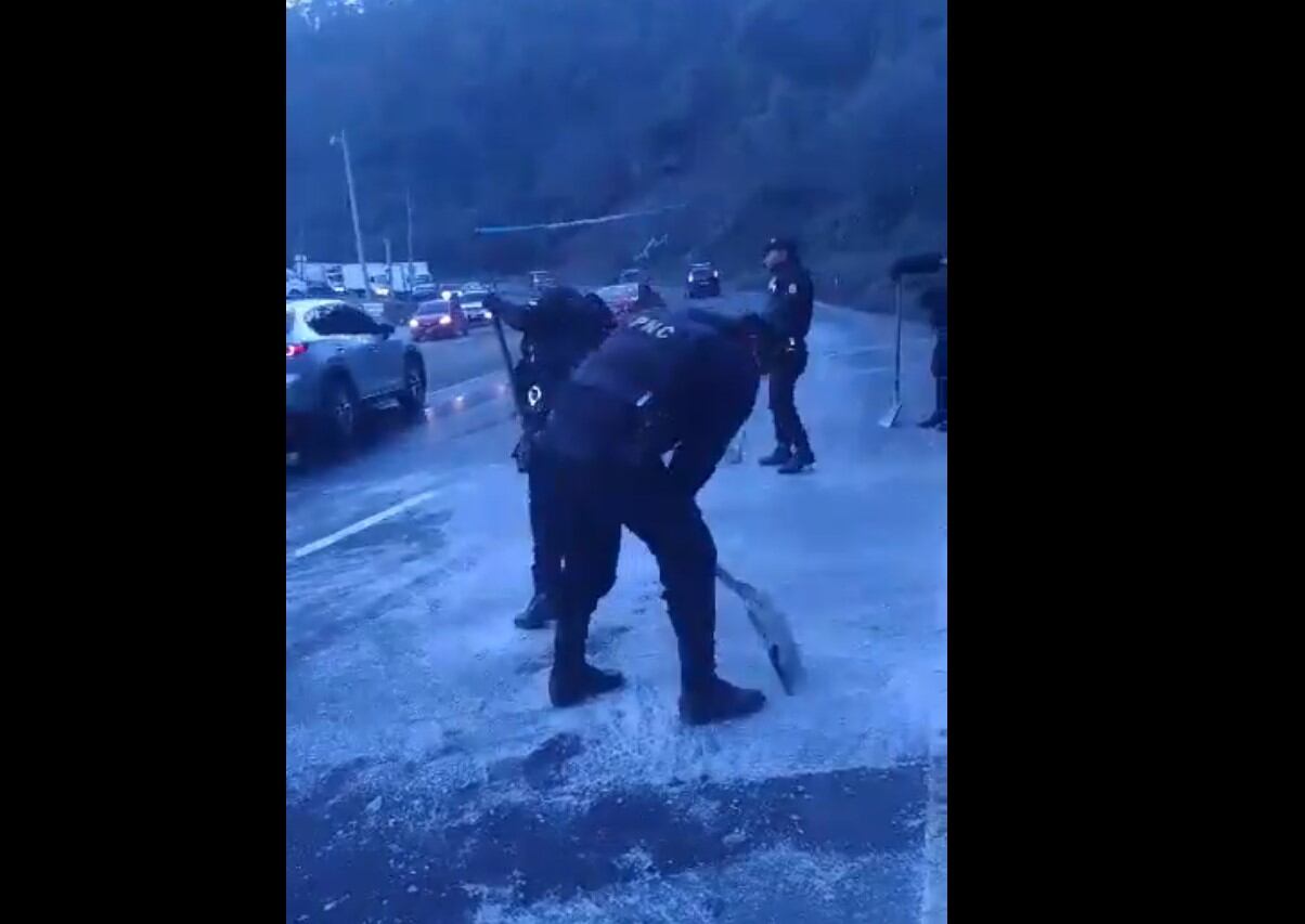 Agentes de la Policía Nacional Civil (PNC) y vecinos trabajan para retirar el hielo y evitar accidentes en el lugar, además recomiendan que los automovilistas circulen con precaución en el área.