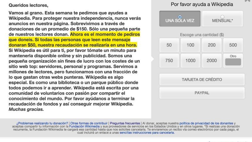 Este anuncio forma parte de la semana de recaudación anual de Wikipedia, misma que busca conseguir recursos para que la enciclopedia virtual continúe siendo un espacio libre, gratuito y sin fines comerciales.