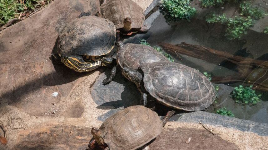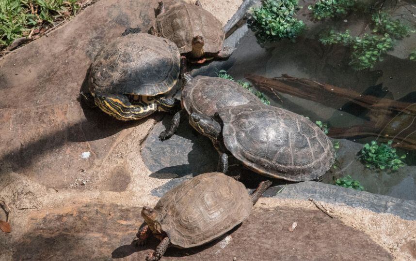 Aunque existen cientos de especies de tortugas, en este recinto habrán 6 residentes de dos especies: Trachemys scripta, también conocida como tortuga pintada o escurridiza; y Rhinoclemmys pulcherrima, conocida como tortuga dragón.