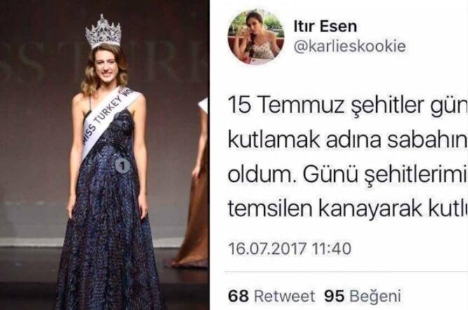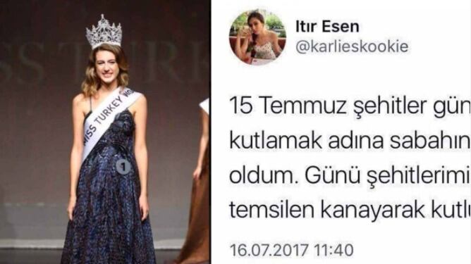 Miss Turquía, Itir Esen, compartió un tuit en 2016 y nunca imaginó los alcances que este tendría. Los 140 caracteres le valieron la corona a la estudiante universitaria, quien perdió el derecho a representar a su país en el certamen de belleza.