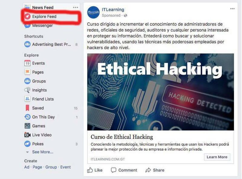 En la nueva sección de Facebook, “Explorar” es como un muro alternativo en donde puedes ver el contenido de las páginas que siguen o el contenido que ha sido sugerido por tus amigos.