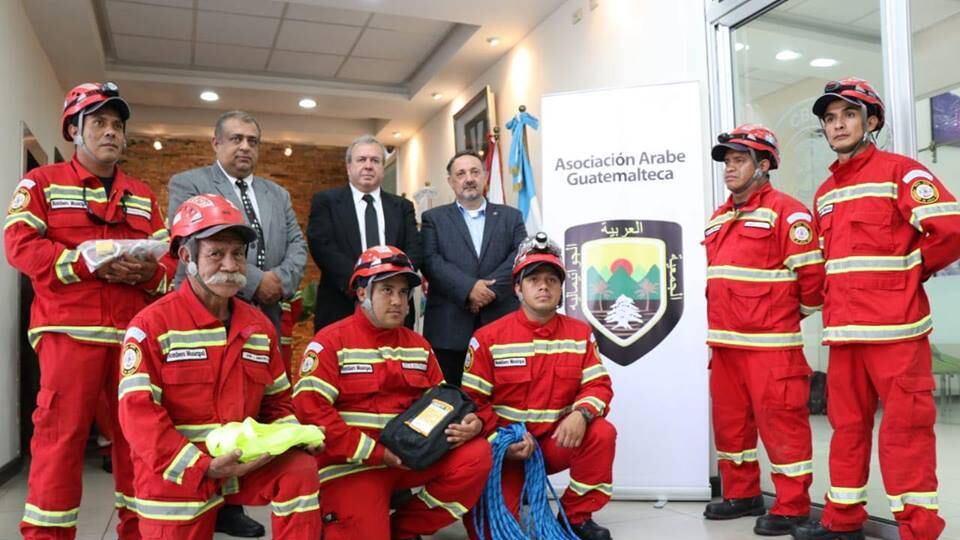 En agradecimiento al esfuerzo de los miembros de esta organización, la Asociación Árabe Guatemalteca ha hecho entrega de una donación que asciente a más de Q67 mil quetzales en equipo especial para rescate. Durante un acto conmemorativo, representantes de la junta directiva de la asociación entregaron las herramientas.Entre ellos, Adel Turjuman, presidente, Jorge Abed, secretario y Alberto Talgi, vocal.