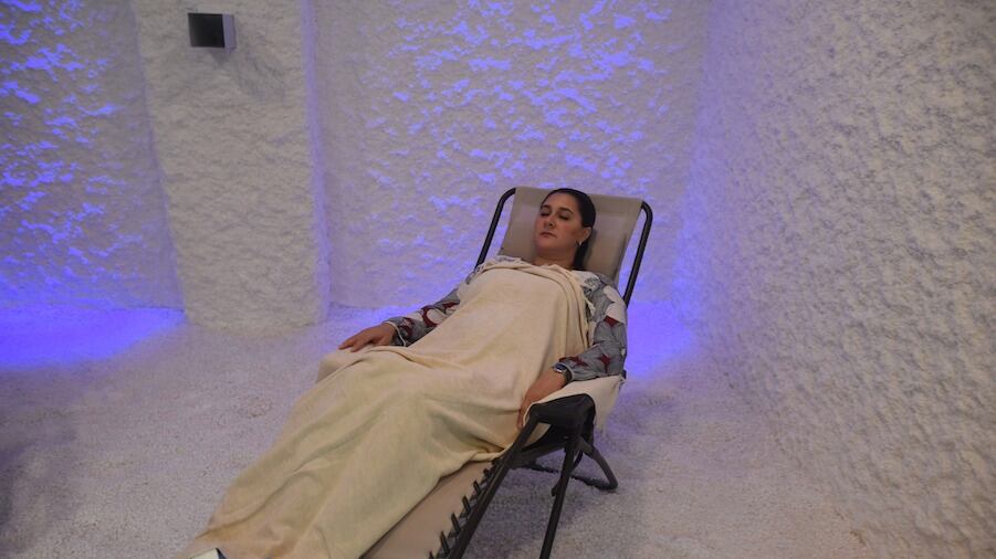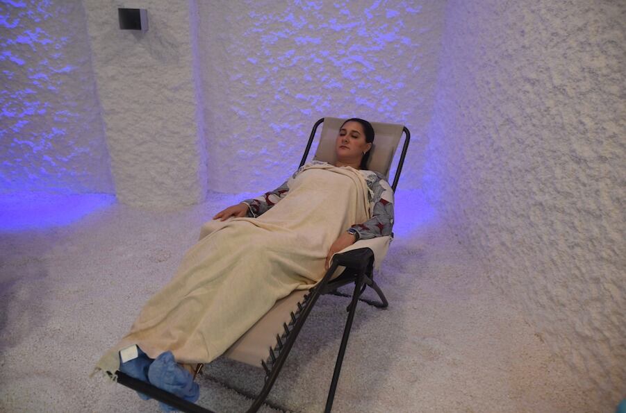 La terapia de sal es el uso terapéutico de sal natural en un microclima simulado, donde la sal es pulverizada y se sopla en un cuarto para que los ocupantes puedan respirarla pasivamente. La sal actúa como un expectorante, acelerando el movimiento del moco en las vías respiratorias y mejorando la función pulmonar. Además, ayuda a eliminar las bacterias nocivas y calmar el sistema respiratorio.