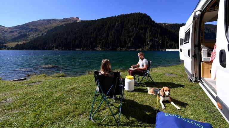 La pareja se toma su tiempo, no viaja lejos, va de excursión, monta en bici. En invierno, trabajan como camareros en una estación de esquí, 70 horas por semana, para poder vivir de esta forma el resto del año.