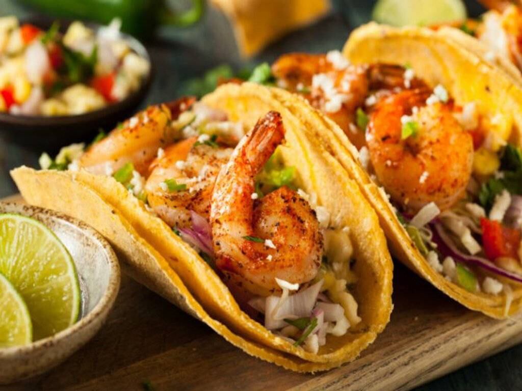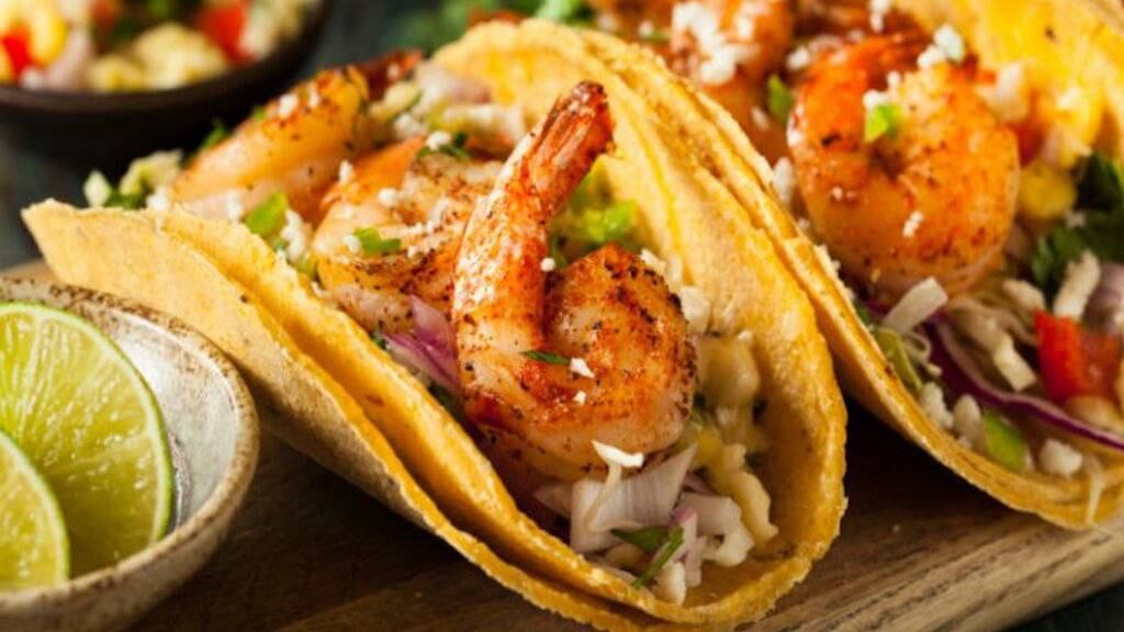 Camarones capeados con coco, sobre tortillas de maíz, bañados de salsas de aguacate, chipotle mayo, lechuga y pico de gallo, acompañado de limón.