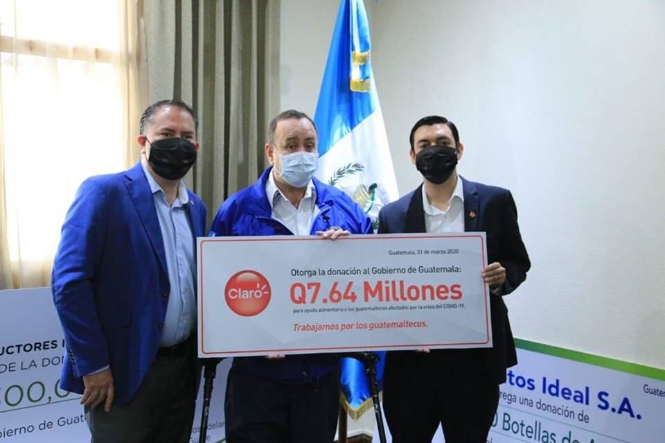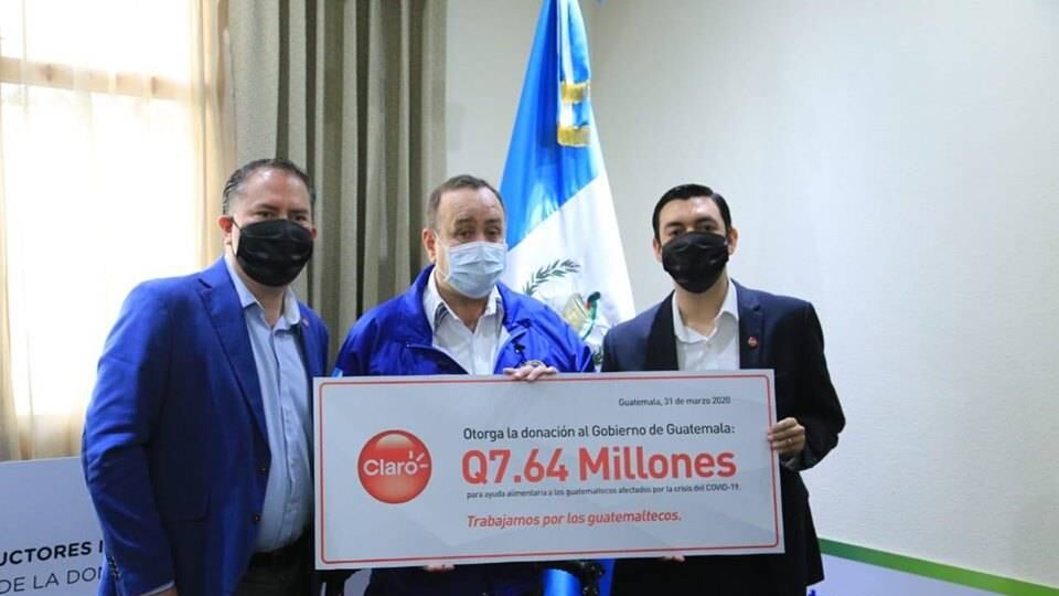 Por ello, en el marco de una reunión en Casa Presidencial, el director comercial de Claro Centroamérica Rodrigo Zubieta, acompañado de Diego Sibrian, gerente de Mercadeo; realizaron la entrega de Q7.64 millones destinados a la compra de canastas básicas alimentarias.