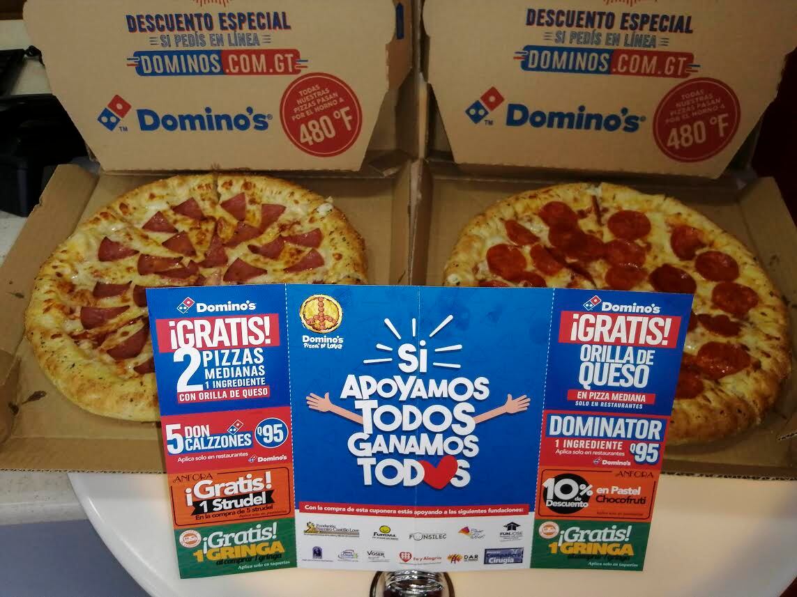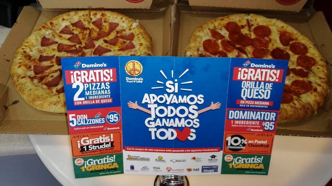 Si tu haces una donación de Q100 podrás disfrutar de los múltiples descuentos que trae consigo la cuponera de Domino’s.