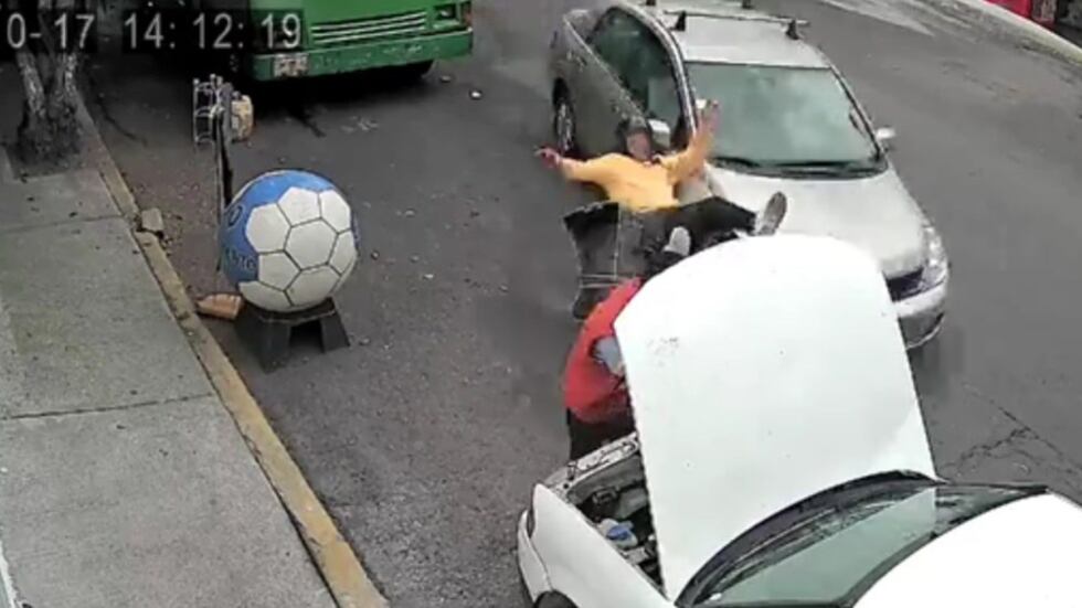 Tanto el motociclista como el hombre que revisaba su carro terminaron en el suelo, aunque se reincorporaron de inmediato.