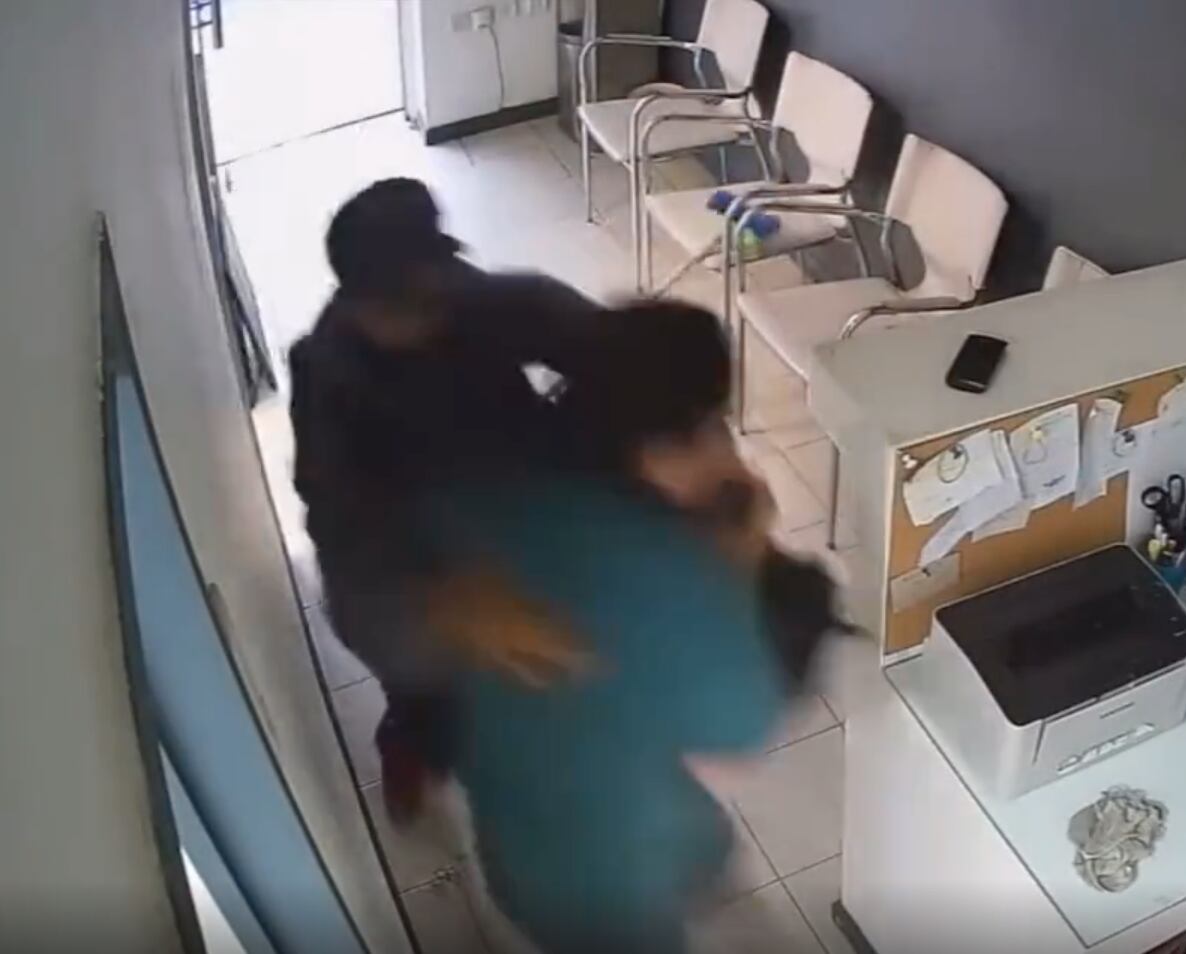 En el video registrado por las cámaras de seguridad del consultorio, puede verse las imágenes del delincuente golpeando a la empleada de limpieza del lugar.