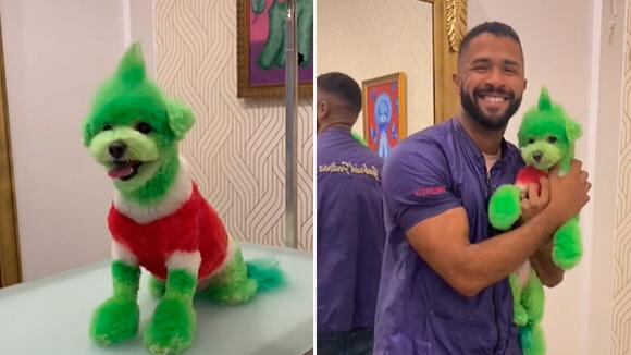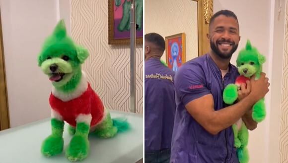En el video viral se ve a un pequeño perro con el peluquero brasileño Gabriel Feitosa, quien se encargó de cortarle el pelo y pintarlo con tintes hasta que asuma la apariencia del conocido personaje que odia las fiestas de fin de año.