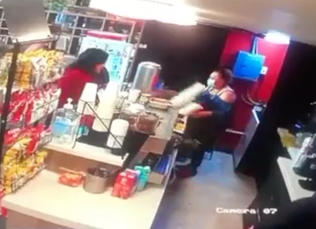 El breve video muestra a la legisladora, vestida con un saco rojo, llegar y tirar lo que parecen ser vasos y otros objetos en el establecimiento, ante la presencia de otras personas.