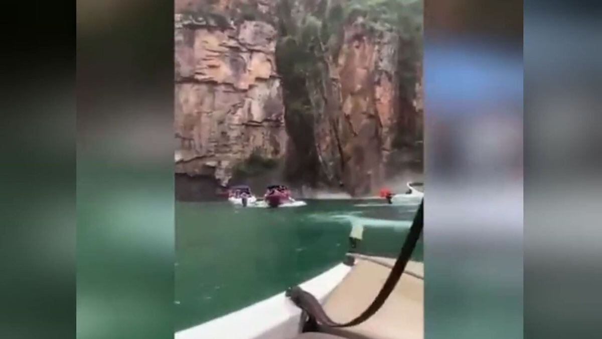 El sábado a mediodía, un gran fragmento rocoso se desprendió de un barranco y cayó, perpendicular, encima de cuatro lanchas que paseaban por el lago Furnas, una región turística de Minas Gerais.