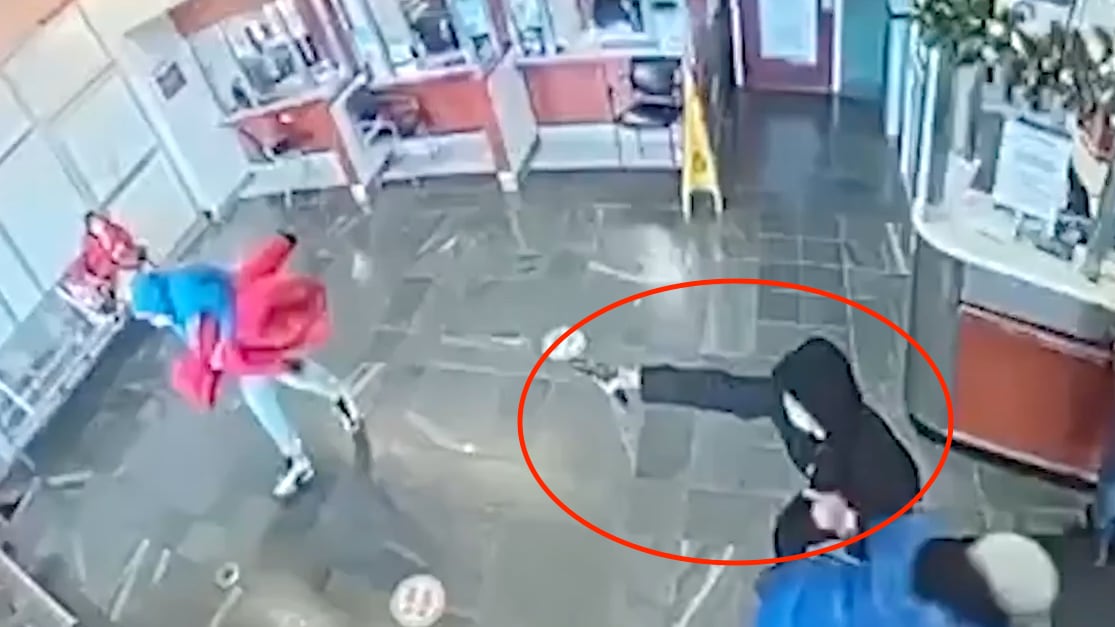 Se puede ver a la víctima, que estaba allí para ser tratada por una lesión anterior, corriendo por el área de espera buscando refugio mientras le disparan.