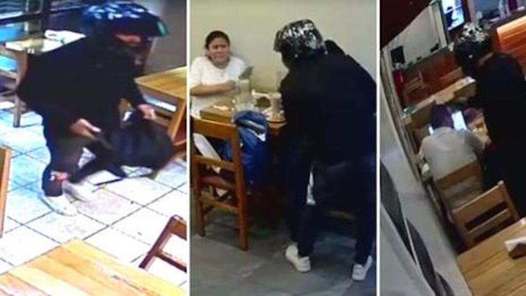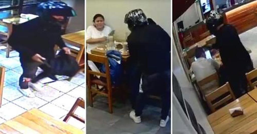 Las cámaras de seguridad muestran cómo el sujeto portando un casco para evitar ser identificado y una mochila, ingresa al local. El sujeto va hacia una mesa y con su arma de fuego amenaza a una pareja de clientes, y golpea a uno con la cacha de la pistola.