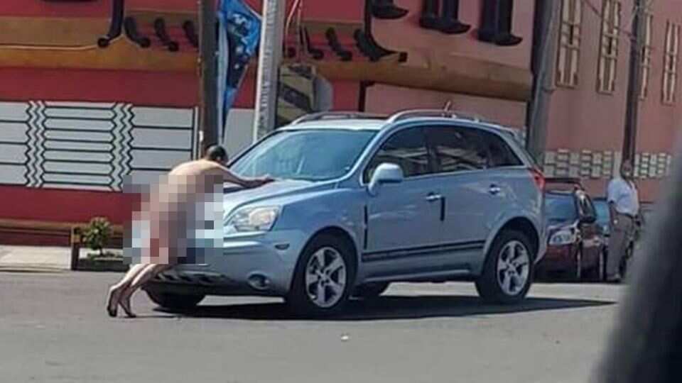 Automovilistas y transeúntes se llevaron una gran sorpresa luego de que un hombre desnudo fuera grabado en el capó de una camioneta enfrente de un hotel, presuntamente suplicando a su pareja que no lo dejara.