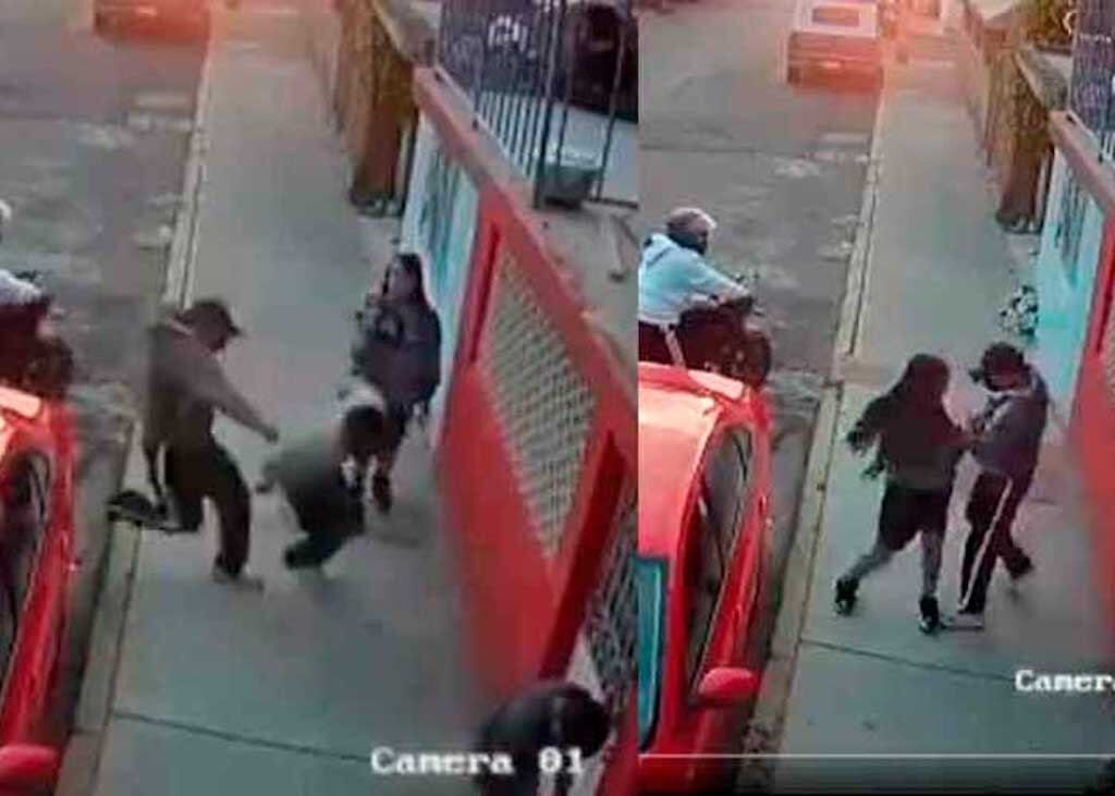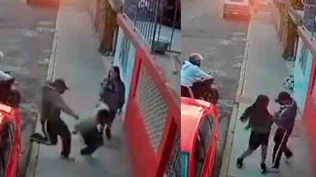 Cámaras de seguridad mostraron cómo un joven abandonó a su novia en la calle al verse intimidado por un par de sujetos que intentaron asaltarlo. Se trata de un hecho en el que se aprecia cómo la pareja de enamorados transita por la vía pública cuando dos motoladrones los interceptaron. Uno de los ocupantes del vehículo de dos ruedas se bajó y pateó al hombre, quien rápidamente comenzó a correr, dejando a su novia más atrás.