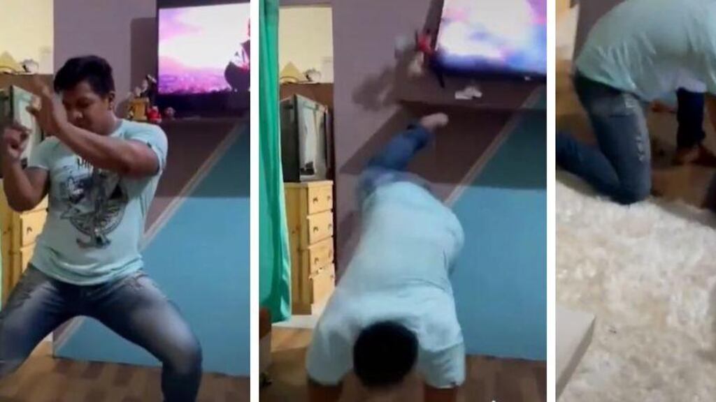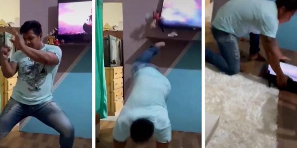 Este baile implica la fuerza de los músculos, sobre todo en los brazos para contraerse hacia el suelo como la famosa. Es por ello que, al momento de tirarse y subir sus pies, golpea su smart tv hasta estrellarla en el piso.