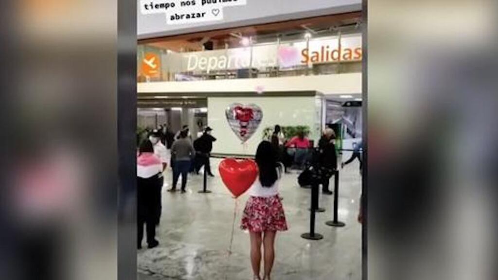 “Cuando vas con globos al aeropuerto por tu amorcito virtual, pasa frente a ti y no te ve. Cuando Fede pasó frente a mí, no me vio y yo con el cubrebocas no lo distinguía, pero antes de que él llegara, yo le di mi teléfono a unas muchachas de Chihuahua y ellas con las pistas que les di nos ayudaron a encontrarnos”, escribió la mujer sobre su video.