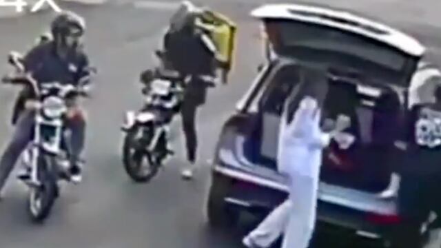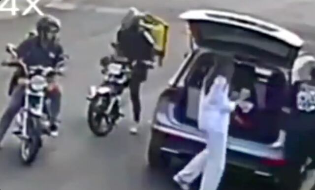 Fingiendo ser repartidores de comida, unos motoladrones asaltaron a una pareja en los exteriores de su domicilio. En un video difundido en redes sociales se observa cuando uno de los delincuentes saca un arma de fuego y apunta a las víctimas, de inmediato también llega un cómplice que se baja a revisar la parte interior del auto.