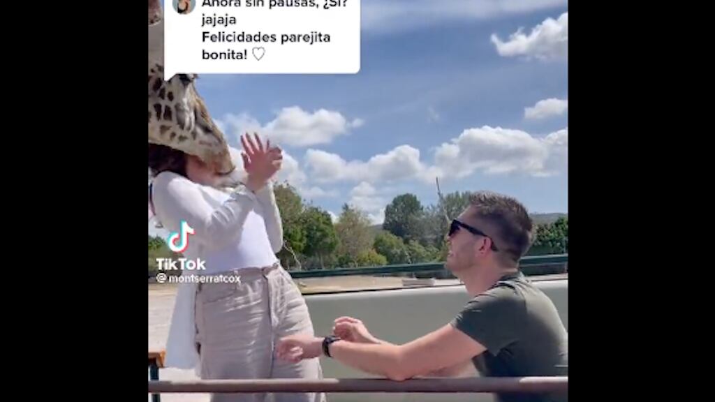 El video se viralizó en TikTok porque la jirafa intervino en el momento justo de la petición de matrimonio. Algunos usuarios preguntaron si se había perdido el anillo, a lo que montserratcox explicó: “No, afortunadamente me lo puso segundos antes del golpe. ¡Es casi imperceptible, pero corrimos”. con suerte!