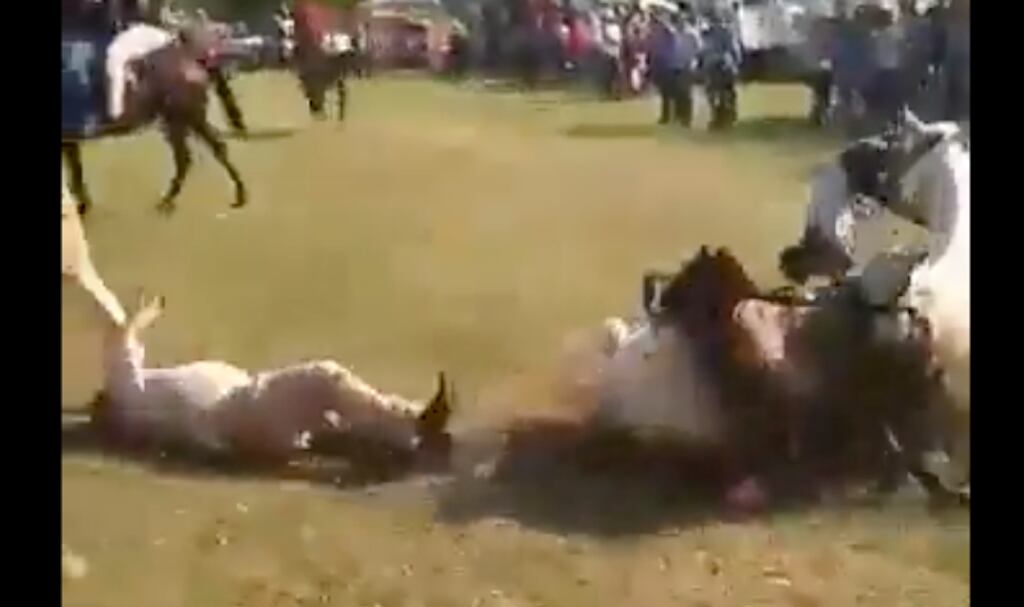 Derivado de la colisión, las personas montadas en los caballos salen “volando”; pero una de ellas se golpea la cabeza, directo contra el piso, y quedó inconsciente de manera instantánea.