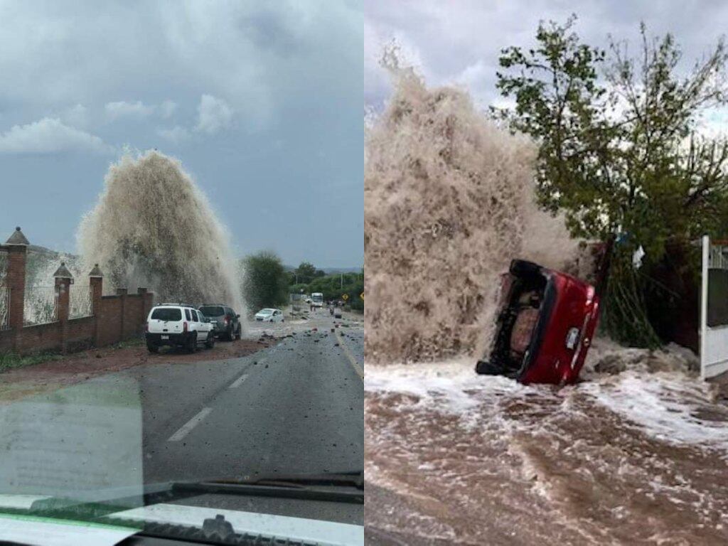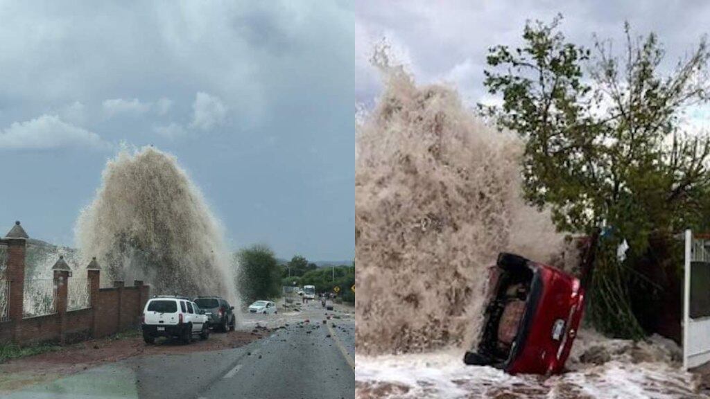 En video fue captado el momento en que la enorme fuga de agua empieza a inundarlo todo e incluso voltea un vehículo particular debido a la fuerza con la que sale.