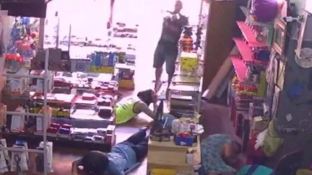 En el video se observa que mientras los ladrones guardan en sus mochilas el dinero y diversos artículos, el policía vestido de civil los sorprende por la espalda. Al ver la intervención del oficial, los empleados de la tienda también se tiraron al suelo, probablemente por miedo a que se fuera a desatar una balacera.
