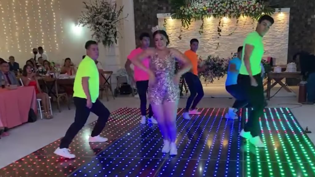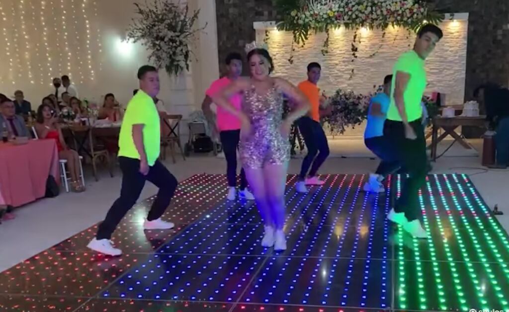 En el material de un minuto con 12 segundos de duración se observa a la quinceañera en medio de la pista de baile, rodeada por sus cinco chambelanes, que esperan el inicio del tema musical.