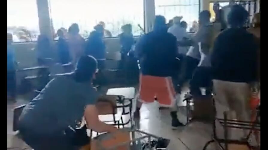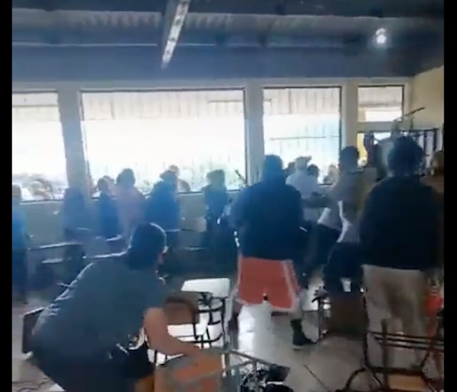 Las imágenes muestran a los adultos ya enfrascados en la discusión, empujándose unos a otros, mientras se sueltan puñetazos, lanzan sillas y cualquier cosa a su alcance, como un casco de moto o una sombrilla. Algunas personas caen al suelo, mientras otras ya muestran “huellas de guerra”, pues sus ropas se observan rotas