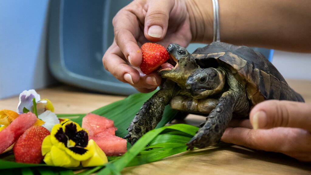 Janus, la tortuga bicéfala más vieja del mundo, recibió este sábado flores comestibles por su 25º cumpleaños en el Museo de Historia Natural de Ginebra, donde vive.